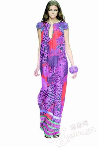 明艷的粉紅裙身上密布著斑馬紋、豹紋和各種部落圖案,傳達(dá)出強(qiáng)烈的異域民族風(fēng)情,長及腳踝的裙身惹人眼球,同色系的超大手鐲更有畫龍點(diǎn)睛之感。