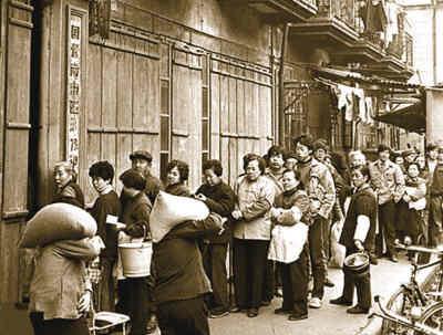 1982年,一個寒冷的冬天,人們在上海市中心的國營南市區(qū)第72號糧店門口排隊(duì)買米。排隊(duì)的人們把凍僵的雙手塞進(jìn)口袋里或縮到袖子里。隊(duì)伍很長。王文瀾攝