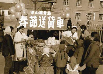 20世紀(jì)60-70年代商品短缺時期,年貨也需憑證配給。圖為黑龍江省哈爾濱市中山服務(wù)站的送貨車將年貨送到居民大院。來源:人民網(wǎng)