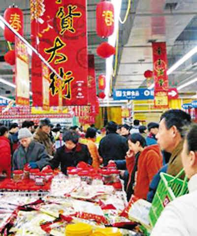 2002年春節(jié)前夕,南京中央金城倉儲超市別出心裁,在店內(nèi)辦起了“年貨大街”,市民可以在此將各種傳統(tǒng)年貨一站購齊,既經(jīng)濟(jì)又方便。來源:人民網(wǎng)