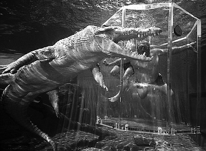 巨大的鱷魚(yú)似乎要給“死亡之籠”里的潛水者一個(gè)“擁抱”。
