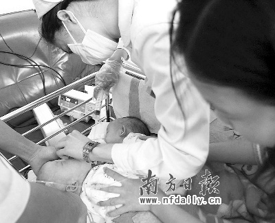 今年9月5日,化州市笪橋鎮(zhèn)一婦女產(chǎn)下一對(duì)連體女嬰。9月8日,連體女嬰被送到深圳市兒童醫(yī)院檢查治療。經(jīng)醫(yī)院檢查發(fā)現(xiàn),連體姐妹各自擁有一個(gè)肝臟,只是兩個(gè)肝臟連在一起,分離手術(shù)的成功率很大。院方?jīng)Q定前日上午9時(shí)進(jìn)行手術(shù)。