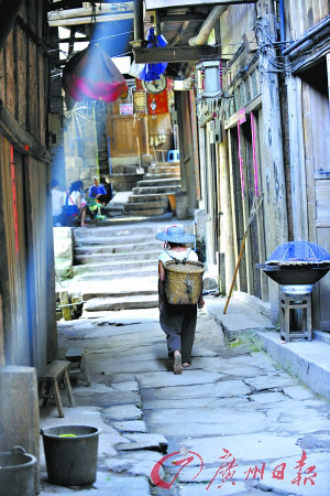 踏著青石板路,陽(yáng)光透過吊腳樓的青色瓦片和綠樹灑落下來(lái),照在正在打盹的老人和貓咪身上,落在剛出爐的金黃色的煙熏豆腐上,還有年輕女人背簍里孩子稚嫩的臉上!敖钟卸嚅L(zhǎng),樓有多長(zhǎng),晴不落光,雨不濕街”,這句當(dāng)?shù)氐乃自,似乎也可以套用在我們廣州的騎樓上,不過對(duì)比騎樓,這里更顯寧?kù)o安詳,而且有雕梁畫棟,翹角飛檐,長(zhǎng)廊式的房檐隨街蜿蜒,整座古鎮(zhèn)全系青色瓦片蓋頂,紅漆木板竹篾夾墻,圓柱承重,古樸凝重中透出原汁原味的巴渝人家風(fēng)韻。