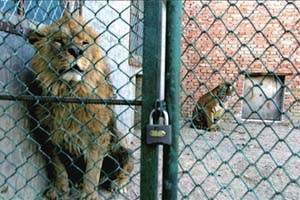 一個(gè)月前,動(dòng)物園的工作人員將4歲多的公獅胖子換到這個(gè)獸舍代替奧肥。或許因?yàn)橄肽願(yuàn)W肥,同同對(duì)這個(gè)新來(lái)的“第三者”十分逃避。胖子體形大,讓尚未和它熟識(shí)的同同害怕不已。而同樣未接觸過(guò)老虎的胖子,也對(duì)同同心生恐懼。在最初的幾天,它們各自躲在自己的獸舍里發(fā)出嘶叫,不敢越雷池一步。放在一起后,它們還曾經(jīng)互相抓撓對(duì)方,直到最近它們倆才開(kāi)始熟悉。