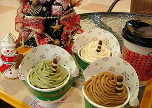 上面有用以鮮奶油調(diào)和層層交迭的栗子泥、抹茶跟焦糖餡,并在頂端灑上雪白的糖粉,呈現(xiàn)充滿冬季耶誕氛圍的白朗峰造型。最后插上可愛(ài)的脆笛餅干,搭配雪花點(diǎn)綴的杯身,好像一棵棵美麗的圣誕樹(shù)一般,尤其搭配圣誕餐桌更有FU~。