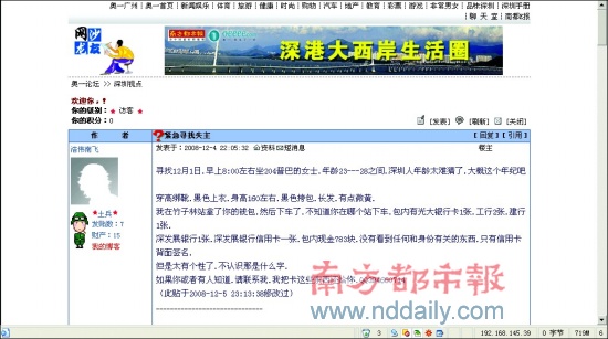 發(fā)帖人稱,其日前偷了一位看上去十分善良的美女的錢包,感到很后悔,于是每日早上8時在同一地點乘坐204路尋人,可惜都沒有找到那位女孩。他請人辨認出失主信用卡上的名字為“管某珍”,希望通過本報找到這位失主,將卡歸還。