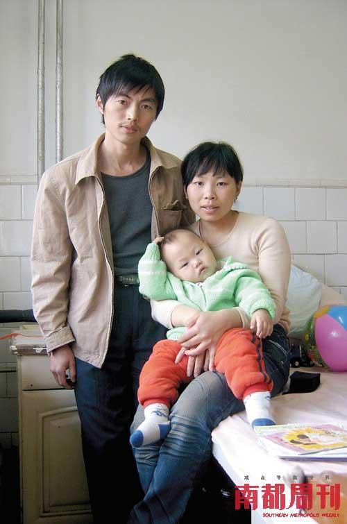13個(gè)月大的結(jié)石寶寶楊歡和父親楊勇、母親李小紅在徐州市兒童醫(yī)院病房