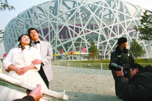 “地點(diǎn)什么的不重要,只要我倆能手牽手,一起走到老!弊蛉,鄭廣明與身穿婚紗的妻子賀晨曦手牽手出現(xiàn)在鳥巢外,拍攝婚紗照。來自牙買加的游客戴文聽說了他倆的感人故事后,提出和二人合影,并送上他的祝福。