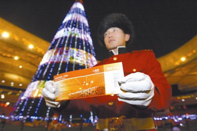 國家體育場(chǎng)“鳥巢”昨起正式啟用新票樣。此外,從昨天起到明年1月10日,“鳥巢”每天的閉場(chǎng)時(shí)間將延后一小時(shí),由原來的18時(shí)延長至19時(shí)。(金可/攝)
