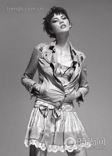 不想讓機(jī)車皮裝過分硬朗,那么內(nèi)衣外穿和粉嫩的短裙就是不可或缺的。