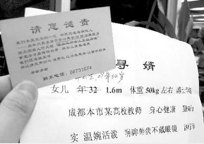 這是一份不同尋常的征婚啟事。它印在名片上。言語中,滿是自責(zé)。文字來自于父母:當(dāng)年只要求孩子學(xué)習(xí)再學(xué)習(xí),努力再努力,而不顧人倫天理,堅(jiān)決反對(duì)女兒交往異性,時(shí)至今日雖悔悟自責(zé),然女兒青春難再……