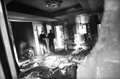 昨日上午9時30分許,記者在火災現場看到,房屋客廳內一片狼籍,地板、沙發(fā)、電視機等都被燒毀,窗戶被撬開,墻壁都被熏黑了,門前有一個使用過的滅火器。 民警、消防人員正在勘查現場。