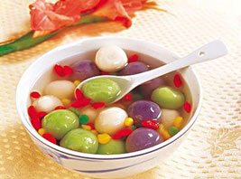 正月十五吃元宵,“元宵”作為食品,在我國也由來已久。宋代,民間即流行一種元宵節(jié)吃 的新奇食品。這種食品,最早叫“ 浮元子”后稱“元宵” ,生意人還美其名曰“元寶” 。元宵即"湯圓"以白糖、玫瑰、芝麻、豆沙、黃桂、核桃仁、果仁、棗泥等為餡,用糯米粉包成圓形,可葷可素,風(fēng)味各異?蓽、油炸、蒸食,有團(tuán)圓美滿之意。陜西的湯圓不是包的,而是在糯米粉中"滾"成的,或煮司或油炸,熱熱火火,團(tuán)團(tuán)圓圓。