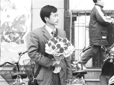 昨日上午9時許,記者在余家頭武商量販店門口看到,一個身體單薄的、穿藍色西裝的小伙子,手捧鮮花和禮品,在街頭等自己心愛的人已經(jīng)3天3夜了。記者看他面容已經(jīng)顯得有些憔悴,但是在記者和眾人的勸說下,他依然不愿離開,還要在那兒繼續(xù)癡癡地等待(見圖),以這種近乎瘋狂的求愛讓“女友”回心轉(zhuǎn)意。
