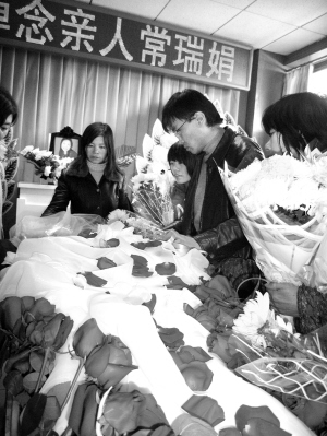 昨天上午9時(shí)許,八寶山殯儀館百合廳門前聚集著許多手持菊花的人,他們都是為常瑞娟送別的。隨后,娟子的男友劉貴年帶著娟子的家人走進(jìn)百合廳。他面容憔悴,嘴唇毫無(wú)血色。殯儀廳的中央,娟子靜靜地躺在那里,身穿潔白的婚紗,身上被鮮艷的紅玫瑰花瓣簇?fù)碇!霸谒∥5臅r(shí)候,我問(wèn)她還能堅(jiān)持嗎?她拉著我的手,用盡全身力氣重重地點(diǎn)了點(diǎn)頭!眱x式上,劉貴年望著女友的臉述說(shuō)著她的堅(jiān)強(qiáng),一直忍著只是哽咽的他突然發(fā)出撕心裂肺的哭聲。在他身邊,娟子的父母姐妹早已泣不成聲,在場(chǎng)的人無(wú)不流下眼淚。在最后對(duì)遺體告別時(shí),劉貴年一直撫摸著娟子的臉。最后一刻,他突然低下頭,深深地吻向女友。