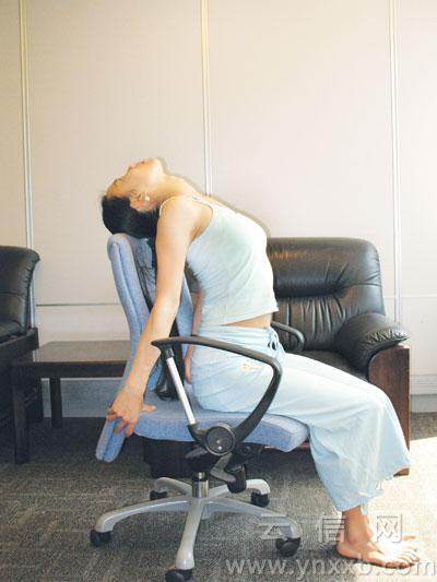 動(dòng)作要領(lǐng):坐在椅子二分之一處,雙手向后彎曲,握住椅子背部。身體保持正直,兩肩向后擴(kuò)展打開(kāi),收腹,呼氣上背后仰,胸部盡量向前挺起,頭部放松靠在椅背上,眼睛注視天花板或閉上雙眼,保持此姿勢(shì)10秒鐘。
