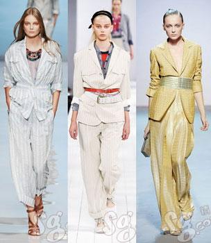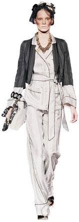 09春夏,Dolce&Gabbana以男式睡衣為靈感,把我們所熟悉的睡衣搬到舞臺上,經(jīng)過改良變成時裝,尤其是褲子結(jié)構(gòu)的創(chuàng)新,這種寬邊褲腳勢必會流行于2009年春夏。這個款式使用具有光澤感和垂感極好的面料,并采用灰白豎條圖案,而這種豎條圖案面料本身就是簡潔韻味的標(biāo)志性符號!八绿籽b”外搭一個黑色小外套,渲染出別具韻味的時尚氣息,美不勝收。而簡潔的款式與閃耀的項(xiàng)鏈搭配相得益彰。還有手中的包包配有金屬鏈條具有很強(qiáng)的裝飾感。