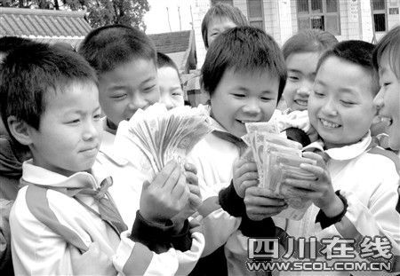 這里距離學(xué)校還有1000多米,8人身負(fù)特殊使命,一路小跑!皥蟾胬蠋,我們交錢來了!”教導(dǎo)主任易光勇正準(zhǔn)備去上課,門口擁來的一群孩子送來一大堆現(xiàn)金,令他十分感動。在易光勇的幫助下,孩子們把錢分成幾組,大家分頭清點,然后統(tǒng)一統(tǒng)計,共有現(xiàn)金8900元。