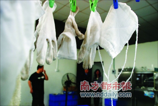 “要客戶收貨,就一定要讓所有的餐具上不能有一點油漬和殘渣,所以餐具打包裝之前,一定要用手套或毛巾擦干凈。”老板娘對記者說。然而,用于擦拭餐具的手套、毛巾都是隨處擺放,有的掛在電風扇上,有的甚至放在地上。大部分手套的指尖部位都已經(jīng)發(fā)黑,甚至磨破了。