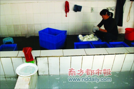 洗碗間有一個運送回收餐具的側(cè)門,一名40歲左右的女工正在側(cè)門外清理剛運回來的餐具。只見她將餐具上殘余的青菜、骨頭等抓起甩到一邊后,把餐具放入一桶白色的水里清洗一遍,然后送入洗碗間。據(jù)該位女工表示,白色的水是用洗潔精和氯水調(diào)制的消毒水。