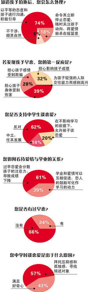調(diào)查顯示,六成受訪者明確表示反對中學生談戀愛,只有兩成受訪者支持中學生早戀。