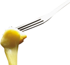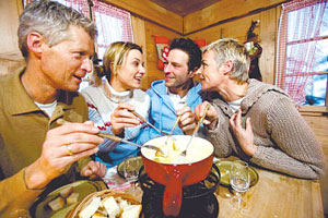 “奶酪火鍋”是瑞士最普遍、最具盛名的火鍋之一。瑞士人制作“奶酪火鍋”一般都是先以蒜涂抹于鍋底,再將不同口味的硬奶酪擦成碎末放入鍋中加熱成糊狀,再加淀粉、白葡萄酒、大蒜、奶油等,繼續(xù)煮并慢慢攪拌至完全融化呈濃濃的煉乳狀,最后放進(jìn)一些黑胡椒即可。上桌后,人們用長柄叉子叉著切成四五厘米見方的“法式長棍面包”蘸著奶酪吃,很像中國的“拔絲香蕉”。此外,吃這種火鍋時(shí),瑞士人還特別喜歡配上有助于清口的風(fēng)干牛肉、腌酸黃瓜、小洋蔥。不過,吃這種火鍋一定要“點(diǎn)到為止”,雖然奶酪富于營養(yǎng),但很難消化,用白葡萄酒融化奶酪,就是為了幫助消化!
