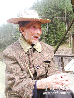 唱歌的老者坐在院壩前,滿頭白發(fā),滿臉皺紋,手拿一根近1米長(zhǎng)的煙桿,煙已熄,他沒發(fā)現(xiàn)。