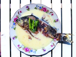 3. 洗凈宰好的鯽魚,刮去腹內(nèi)黑膜,摳掉鯽魚的咽喉齒(位于鰓后咽喉部的牙齒,泥腥味很重),瀝干水分;
