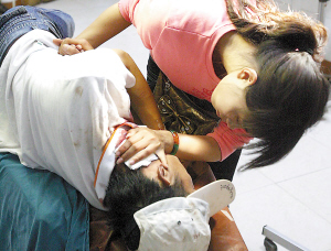 昨日下午3點多鐘,脖子血流不止的周方被救護車送進市急救中心后拒絕進入急診室接受治療。記者看到,周方的脖子左側(cè)有一道長約6公分的刀傷,鮮血直流,染紅了白色T恤和頭上的棒球帽。醫(yī)護人員和匡非好不容易將他勸進去,他卻趴在病床上痛哭不已,約10分鐘后,才平靜下來,接受了縫合處理。據(jù)醫(yī)生介紹,周方的傷口淺,未傷及主動脈,無生命危險。