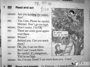 而另一次大家去學(xué)農(nóng)去摘蘋果,Han Meimei爬在梯子上,Jim就很緊張地在下面喊“Be careful!” (董正 和倩)
