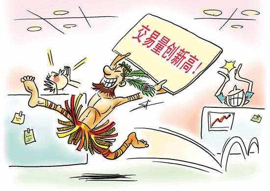 跑到辦公室中間時(shí),這名男子忽然將原本抱在胸前的長方形紙牌翻轉(zhuǎn)過來,高舉過頭頂,上面用超大號(hào)的紅字寫著“交易量創(chuàng)新高”。