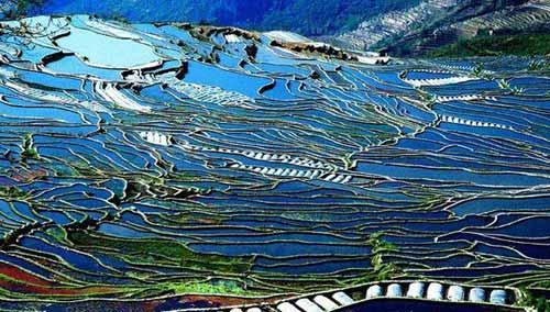 海拔2500米的云南哀牢山區(qū)元陽梯田平地極少,到處是濃綠的原始森林的哀牢山區(qū),世代居住著哈尼族為主的山地居民。2500年前,哈尼族的祖先從西藏高原來到云南南部這個邊陲山區(qū),初來乍到就遇到了一大難題:周圍的山谷根本不適宜種植。哈尼族人以頑強(qiáng)的民族性格與大自然搏斗,用石塊砌起圍墻,圍住新開墾的農(nóng)田,還引來山泉灌溉,并在水霧繚繞的梯田中種植稻谷。