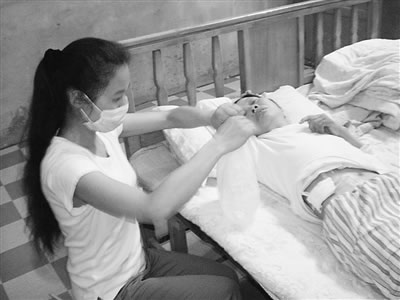 張錦現(xiàn)在每天都會為母親做三次“水透”。為了讓置放在母親體內(nèi)的輸液管不被細菌感染,她就將家里的窗戶緊閉,以防灰塵進入。