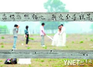 緊鄰的木柵欄上,一對新人在攝影師的指導(dǎo)下趴在上面拍照。不遠處另一對新人則站在了柵欄上面。盡管場地內(nèi)沒有一匹馬,而且圍欄上寫有如此的警示語,但新人們都無所顧忌地以馬場為背景拍照。有一對新人還和攝影師鉆過木柵欄,進入馬場拍攝。