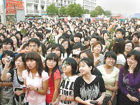 昨天下午,這個特殊的慶生派對在寧波一所高校北區(qū)宿舍商業(yè)區(qū)的中心廣場上舉行。下午4點(diǎn),光鮮的舞臺早已搭好,舞臺上拉著巨幅的噴繪背景,還有樂隊(duì)演奏著歡快的樂曲。