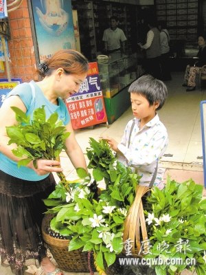 5月19日上午9點(diǎn),空中飄著零星小雨。沙坪壩區(qū)小龍坎新村路入口處,裝滿梔子花的背簍立在人行道上,旁邊蹲著一個(gè)短頭發(fā)、斜背小包的小女孩。有人走近,她立刻放聲大喊:“梔子花,新鮮芳香的梔子花。
