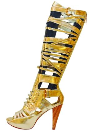 搭配指南:金色夸張的捆綁式高靴,因為本身就很復(fù)雜,所以身上的服飾最好以簡潔為主。復(fù)古透明金鞋很百搭,休閑場合也能成為焦點。