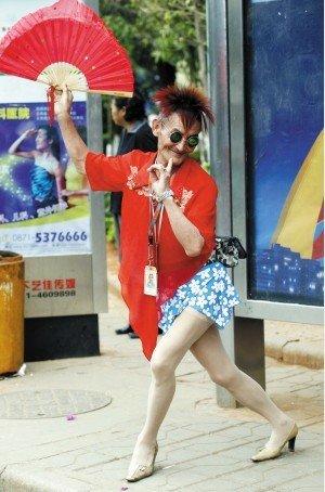 時(shí)髦的尖高跟鞋、絲襪、超短裙、艷麗的襯衫、酒紅色的“雞冠頭”……前天中午,在人流、車流如織的小菜園立交橋,這位時(shí)髦的“美女”大幅度搖擺著臀部,以妖艷的姿態(tài)橫掃著眾人的眼球。而當(dāng)看清“美女”的正面時(shí),大家的眼珠子差點(diǎn)掉了一地——原來,這位“美女”竟是一位老倌。