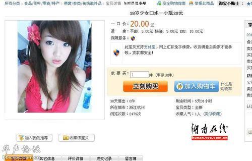 賣時(shí)間,賣青春……在創(chuàng)意層出不窮的當(dāng)下,一店主在網(wǎng)上兜售美少女口水的舉動(dòng)再一次“雷”倒眾人。今日,網(wǎng)友“ximacai”在華聲論壇發(fā)帖稱,雖然淘寶售出的商品花樣諸多,但兜售美少女口水卻還是第一次看到,令他大跌眼鏡。