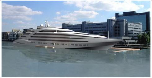 巨型游艇停靠泰晤士河畔的想象圖。