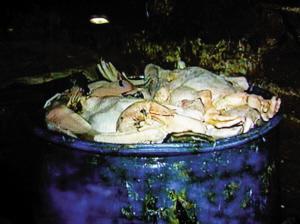 日前,南海當(dāng)?shù)卣鶕?jù)記者提供的線索,執(zhí)法搗毀了多個死鵝、死鴨加工點(diǎn)。在記者暗訪過的一個位于荒地和臭水溝旁的窩點(diǎn),執(zhí)法部門發(fā)現(xiàn)了堆放在桶里和冰柜里的上百只死家禽,有的已腐爛發(fā)臭。用來給死家禽脫毛的瀝青不知反復(fù)使用了多久,臭味很重。據(jù)查,每天僅這個作坊加工、販賣的問題家禽就有四五百只。