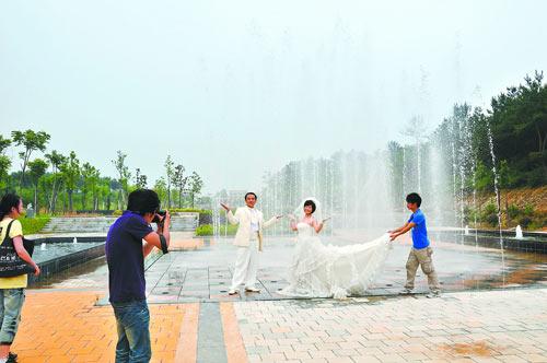 對許多人而言,墓地是忌諱之地,但昨日的黃陂長樂園陵園卻迎來了兩對“80后”新人,他們以陵園里的綠陰湖畔、噴泉長廊為背景,定格一個個甜蜜的瞬間(如上圖)。