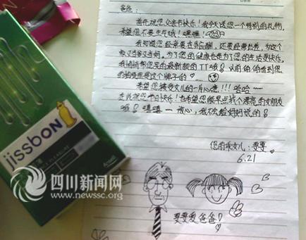 文中這樣寫道:“首先祝您父親節(jié)快樂,我今天送您一個(gè)特別的禮物,希望您不要生氣哦!知道您經(jīng)常在外應(yīng)酬,還要經(jīng)常出差,為這個(gè)家又當(dāng)?shù)之?dāng)媽。為了您的健康也是為了您的生活更快樂,我悄悄幫您買的最新款的TT哦!以前偷偷看到您的抽屜里是這個(gè)牌子的……”言語中,透露出女兒對(duì)父親的感激之情。最后,女兒還俏皮的說“希望您接受女兒的一片心意。。」诖俗D(jié)日快樂!也希望您能早點(diǎn)找個(gè)漂亮的女朋友哦,嘻嘻……放心,我不會(huì)給媽媽說的!”小女孩通篇用語樸實(shí)無華,天真無邪,讀來讓人感動(dòng)。