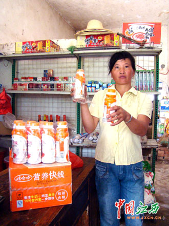 當(dāng)日上午,記者驅(qū)車來到墩上村實(shí)地采訪。今年41歲的鄒根枝兒女都在外務(wù)工,和丈夫鄒新海兩人在家?guī)腿搜b殼子板,每天120多元的收入讓兩人很是滿足,平時(shí)除了吃飯外還特意買些原料補(bǔ)充營(yíng)養(yǎng)。鄒根枝介紹說:“6月20日,我從墩上村鄒德水的便利店里買來一箱娃哈哈營(yíng)養(yǎng)快線,當(dāng)時(shí)怕飲料不新鮮,還特意看了生產(chǎn)日期,見是2009年5月31日生產(chǎn)的才放心買了回去,放在家里晚上看電視的時(shí)候喝,有些時(shí)候我老公(鄒新海)也喝一瓶,但沒有我喝得多。幾天后,我感覺肚子不舒服,上吐下瀉,為此專程搭車到萬年縣石鎮(zhèn)街去買胃藥,花了差不多200元錢病情卻不見好轉(zhuǎn),而且肚子痛得特別厲害。沒有辦法,我只好到屋前的墩上衛(wèi)生所去看病,打了幾天吊針以后病情才有所好轉(zhuǎn)。這次看病不僅花費(fèi)了近400元醫(yī)藥費(fèi),還耽誤了一個(gè)多星期沒有干活,就連前兩天插秧都是請(qǐng)人干得,我的損失可大了!