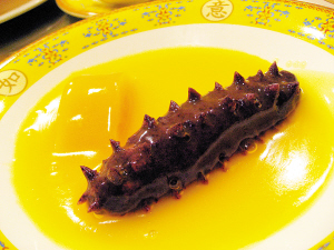 這種餃子太獨特了,是花樣餃子的一種,尤其是遼參餃,它是餃子宴以現(xiàn)代時尚形式開席的第一道,褐色晶亮澆著汁的遼參一上桌就驚艷四座,要不是吃心不改提前就知道,也許會驚呼出來,真的太像了,幾乎毫無破綻。這遼參餃外皮是黑米面,是如今最流行的甜餃子面皮,遼參的刺兒是用剪子剪出來的,主廚還嫌這次的刺兒剪得太有規(guī)律了,有點不像了,面皮里面的餡是什錦豆沙,一點都不甜膩,外澆的是橙汁,配菜是南瓜,真是一道養(yǎng)眼開胃又能帶來驚喜的餃子呀!其實它是蒸餃的一種,而且還可以換芝麻芋泥、八寶雪梨、五仁山楂等其他甜餡兒,但是要提前預訂。