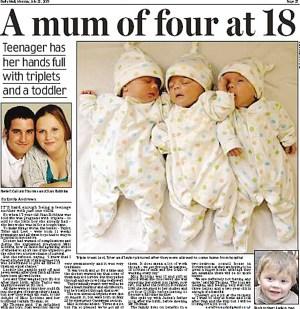 目前,斯安和2歲的兒子加登住在一套政府提供的廉租公寓中,完全靠政府救濟(jì)生活,她每月能領(lǐng)到1126英鎊救濟(jì)金,其中包括房租、兒童福利和家庭稅收貸款。盡管如此,斯安母子二人的生活仍十分拮據(jù)。去年,斯安又結(jié)識(shí)了19歲的新男友卡魯姆·托馬斯,盡管斯安和卡魯姆都沒想過要生孩子,但去年10月,當(dāng)時(shí)只有17歲的斯安卻再次意外懷上了身孕。更讓斯安做夢(mèng)也沒想到的是,她懷上的竟是一組三胞胎!