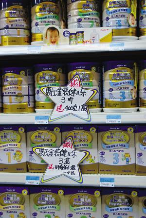 但昨天在一些商場看到的惠氏促銷廣告上赫然標(biāo)注著:“購買900克的三聽,送400克的一盒。”黃女士跟記者算這筆賬:“一聽金裝幼兒樂第三階段奶粉漲了17元,如果買三盒,就等于貴了51元,但贈(zèng)送一盒400克裝的,價(jià)值56元(漲價(jià)前),算起來,等于沒漲價(jià)。只是要多買幾瓶罷了。但現(xiàn)在是夏天,也不知道奶粉多買了能不能保存!