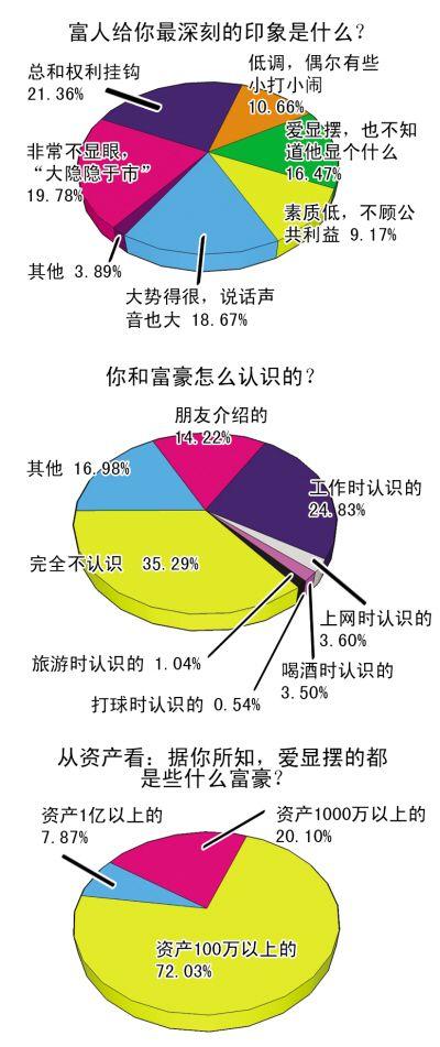 認為“現(xiàn)在的富豪很低調(diào)”、“大隱隱于市”、“發(fā)家清白”的網(wǎng)友,比認為“富豪一副勢力相,嗓門比常人高八度”的網(wǎng)友多兩個百分點。但在“和富豪是怎么認識的”這一項調(diào)查中,有25%的網(wǎng)友稱自己在工作中結(jié)識過富豪。