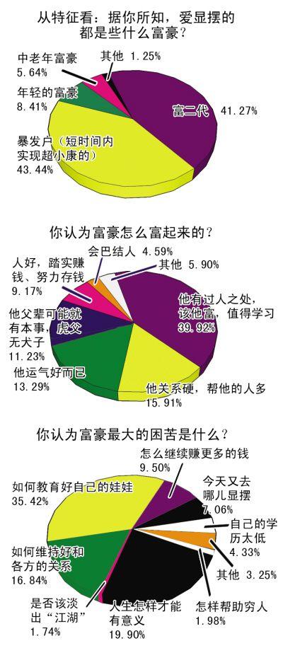 重慶社科院專家孫元明認為,富豪總會被投以或羨慕,或嫉妒的眼光,這引起無數(shù)圍繞“富豪”的話題。其實表明,人人都想變成富豪。在富豪的身上,無論你能挑剔出他多少缺點和不是,但不可否認的是,富豪總有不同一般人的長處,他們或許是比你們更有毅力,更能吃苦,或者僅僅是更會交際,但這一個“更”字,就讓他們跨入了富豪的圈子。記者 王薇 見習記者 張思思 實習生 杜鑫