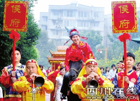 高頭大馬、花轎鳳冠、迎親嗩吶……一場(chǎng)熱鬧喜慶的中式婚禮吸引了眾人的眼光。昨日上午,在成都沙河公園,成都小伙侯俊用這樣的方式迎娶重慶新娘稅嘉;閼c公司策劃人曾真說(shuō),隨著中秋即將來(lái)到,國(guó)慶大假期間不少新人放棄了婚紗香檳下的西式婚禮,采用傳統(tǒng)中式習(xí)俗。